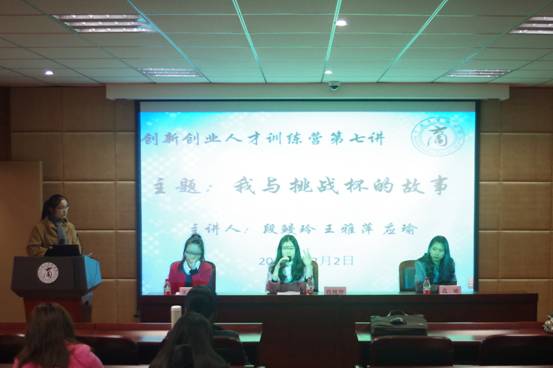 12月2日下午,色情av影片 创新创业人才训练营第七讲“我与挑战杯的故事”在色情av影片 109报告厅顺利开讲。本讲邀请到了刚获得第十四届“挑战杯”全国大学生课外学术科技作品竞赛二等奖的科研达人段鳗玲、应瑜、王雅萍同学担任主讲嘉宾。色情av影片 创新创业人才训练营成员、色情av影片 2015年 “创青春”大学生创业大赛色情av影片 参赛团队代表参加了本次活动。