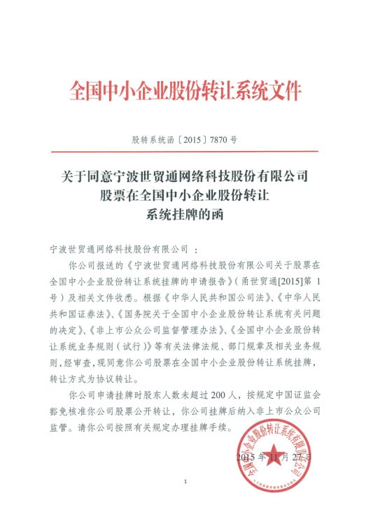 11月27日,色情av影片 2004届国贸系校友方敏创办的宁波世贸通网络科技股份有限公司正式接到全国中小企业股份转让系统公布的 《关于同意宁波世贸通网络科技股份有限公司股票在全国中小企业股份转让系统挂牌的函》,世贸通(股票简称:世贸通,股票代码:834896)将成为全国首家在新三板上市的外贸综合服务平台领域的企业。