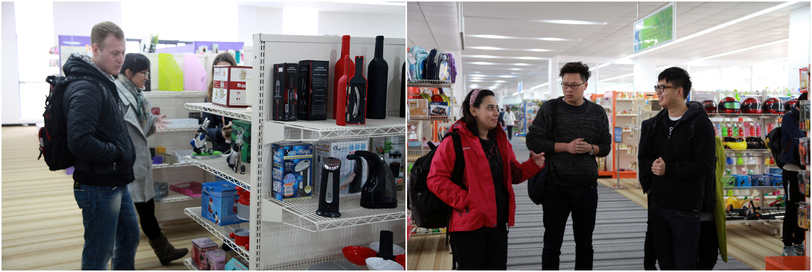 留学生们首站参观来到企业的样品间。赛尔集团拥有几乎宁波市最大的成品样品间,占地4000余平米,其间以不同门类的货架对5000多种贸易样品分门别类地进行陈设。展间的全开放环境,及专门配备的手推购物车,令参观样品间的客户能够在轻松交互的氛围中,更加方便地选择自己感兴趣的样品。这些对国际贸易兴趣浓厚的留学生们仿佛置身于贸易展览会现场,一边仔细聆听着企业人员的解说,一边饶有兴趣地拿起那些造型新颖的定制类产品开始研究其构造。