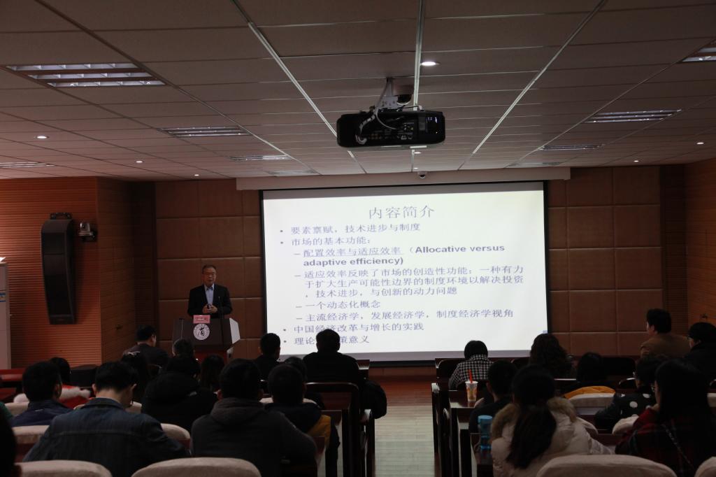 宋立刚教授从国家经济增长动力源泉的三个方面:要素禀赋、技术进步和制度入手,以市场配置效率和适应效率为切入点分析了当前中国经济的转型发展之路,对“企业家精神培育”、“市场竞争与创造性破坏”、“经济增长的源泉与机制”、“技术进步与市场非竞争性”等多方面内容作了详细探讨。他在报告中提出寻求新经济增长源泉与机制(技术内生化过程)的基础是全面发挥市场的基本功能既包括其配置效率又包括适应效率,市场适应效率的改善和配置效率的加强有赖于制度层面和政策层面上的改革与调整。主题报告结束后,宋教授与现场师生进行了互动和交流,并对师生提问给予了耐心回答,现场气氛热烈。