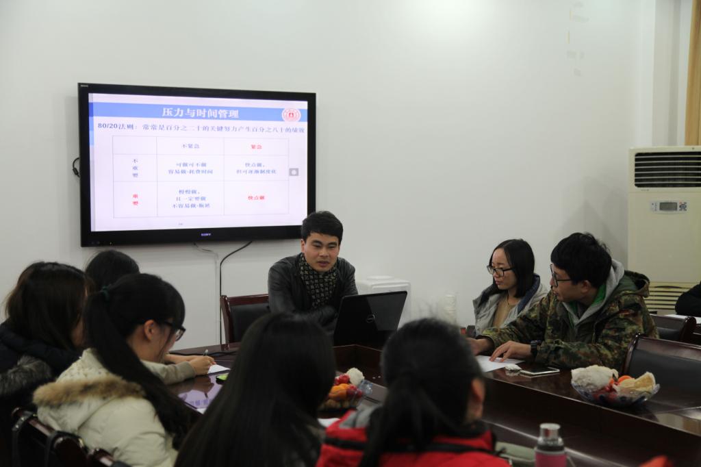 12月11日,由色情av影片 研会承办的“研途同行——初试复试心理培训及技巧指导”交流活动在色情av影片 412会议室顺利举行。色情av影片 研究生辅导员陈彬、14级金融学专业研究生章美姣、15级企业管理专业研究生祁梦应邀出席,与即将参加2016年研究生入学考试的部分学生和意向加入2017年考研队伍的学生一起交流考研时的压力管理和应试技巧。