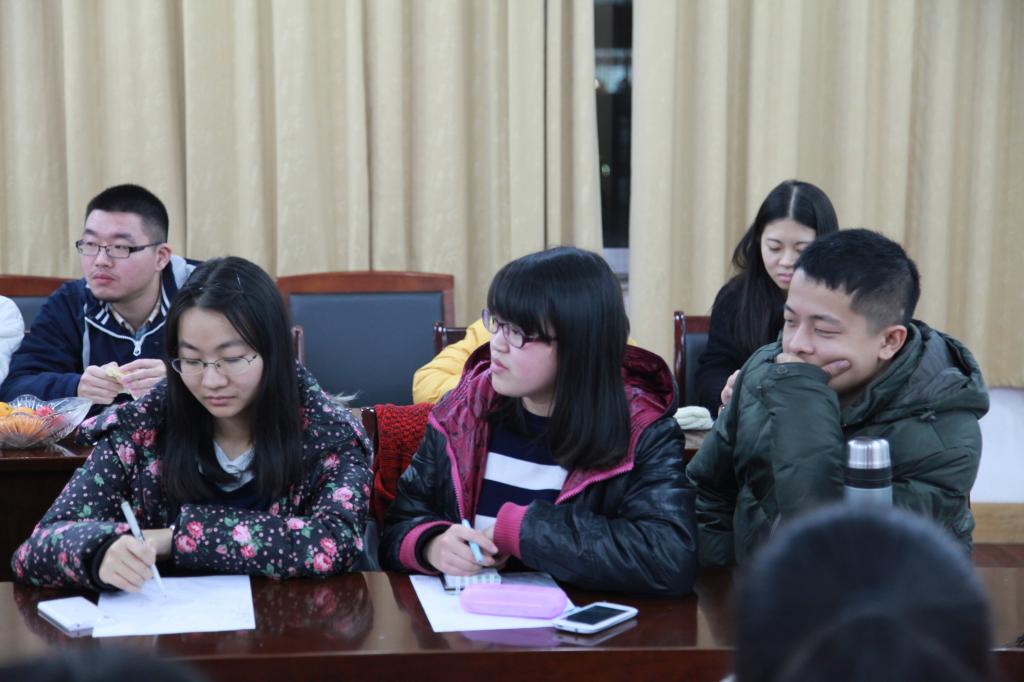 陈彬老师从心理学专业视角出发,为同学们分析了压力的来源,并从思想、行为、饮食几个方面提出了缓解考研压力的方法。在讲解过程中陈彬老师还穿插了心理学小游戏、宁静练习,现场同学高度参与和配合,气氛十分融洽。随后,2014年优秀考研学生代表章美姣同学结合自己的考研经历,跟大家分享了自己是如何准备考研的,她告诉大家在考场上要保持良好的心态,并提出“在考研过程中,坚持是最重要的”,鼓励大家坚定自己考研的目标。祁梦同学作为2015年考研优秀学子,和大家分享了自己步入考场时的经历和各个科目的答题技巧,并着重强调了选好考场附近住宿的重要性。