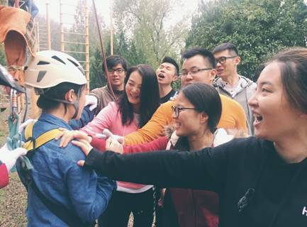 次日早晨,天空飘着蒙蒙细雨,拓展基地里的器械都变得湿漉漉的,运动鞋踩上去有点滑。在勘察了现场,确保拓展安全性之后,MBA学员们依旧兵分两路,前往“空中单杠”训练现场,完成自我挑战。“空单”是整个训练基地中最有挑战性的项目之一,学员要在安全绳索的保护下,徒手爬上7米高的立杆,在仅仅容得下两只脚的圆形铁盘上腾空跃起,抓住前方3米处的横杆,而保护索的伸缩控制全掌握在同组的小伙伴手中。这个项目训练的是人的胆量和“勇气”,23名学员在同伴的加油鼓劲下,都以不同形式完成了挑战,不少人在项目结束后,还对这凌空一跃津津乐道,分享着彼此的经验感悟。最后一个项目是“求生墙”。两个小分队重新合并,通过人梯、倒挂、托脚丫、抬屁股等形式,将整个团队23名学员逐一输送到高达3米的高墙另一端,在“必胜”和“责任”的精神驱使下,在同伴们此起彼伏的加油勉励声中,完成了看似不可能完成的任务,成功取得了集体性胜利。