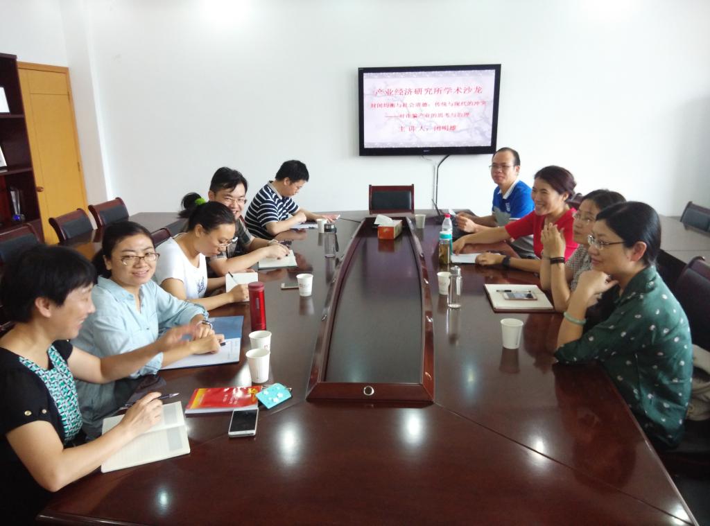 2016年9月28日上午8点,色情av影片 学术沙龙(2016年第6期)在11#412会议室如期举行。学术沙龙由产业经济研究所所长胡求光教授主持,产业经济研究所闭明雄博士做了精彩的学术报告。色情av影片 副院长杨丹萍教授、产业经济研究所教师和部分同学参加了此次学术活动。