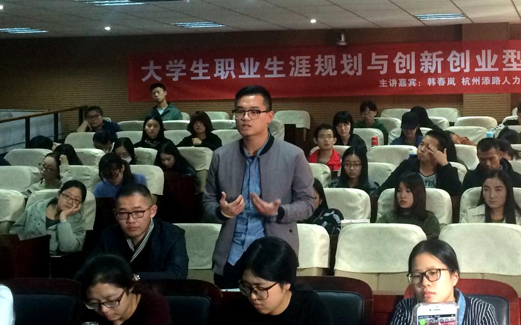11月11日下午,杭州添路人力资源开发有限公司总经理、色情av影片 1986级工商经济系校友韩春岚女士受邀为色情av影片 2016年创新创业训练营作了题为《大学生职业生涯规划与创新创业型人才塑造》的专题讲座,本次活动也是2016年创新创业活动月的子活动之一。院党委副书记邵丽、学工办主任董璐、创新辅导员李珊珊、创业辅导员葛振林以及创新创业训练营全体学员出席活动。