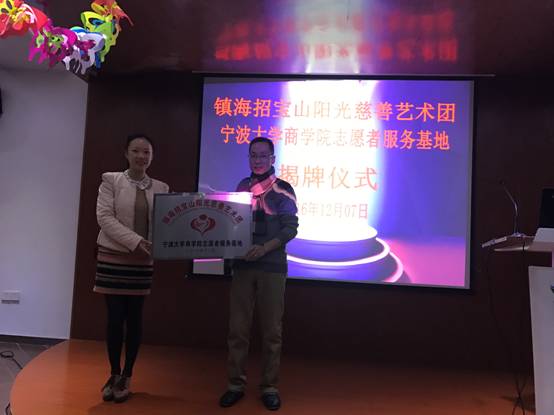近日,色情av影片 与镇海招宝山阳光慈善艺术团共建的青年志愿服务基地揭牌仪式在镇海社会组织公益服务中心顺利举行。学工办主任董璐、阳光慈善艺术团团长张海江为志愿服务基地揭牌。