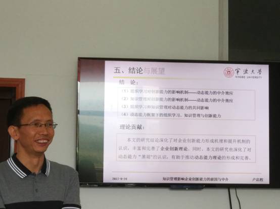 卢启程博士后通过数据分析和实例研究,发现虽然大量的研发投入增强了企业的组织学习和知识获取能力,增加了知识基,同时也扩大了企业在业界的影响力,但广泛的产学研合作、大量的创新投入并未给企业带来显著的研发绩效。现有研究未能在知识与企业创新能力之间构建有效联系,知识与创新的关系模糊,动态能力在组织创新中的地位不明确,需要在统一的战略框架下认识组织学习、知识管理对创新能力的影响。卢博士后在文献研究的基础上,通过典型案例研究和大规模问卷调查开展实证分析,再应用实证结果对理论和假设做出修正,并在管理实践方面做了的探索。卢博士后关于创新能力整合模型的提出和验证有效地回答了“组织学习和知识管理如何带来创新能力提升”这一理论难题;引入企业动态能力理论实现创新与主流战略管理理论的对话与融合,有效地回答了“为何同样的知识平台和学习努力,却存在不同的创新绩效”这一理论难题。报告之后,点评专家高度评价了卢启程博士后所做的研究工作,并就创新能力与企业绩效之间的关系展开了讨论,提出在后续研究中可以将企业异质性这一变量纳入研究体系。