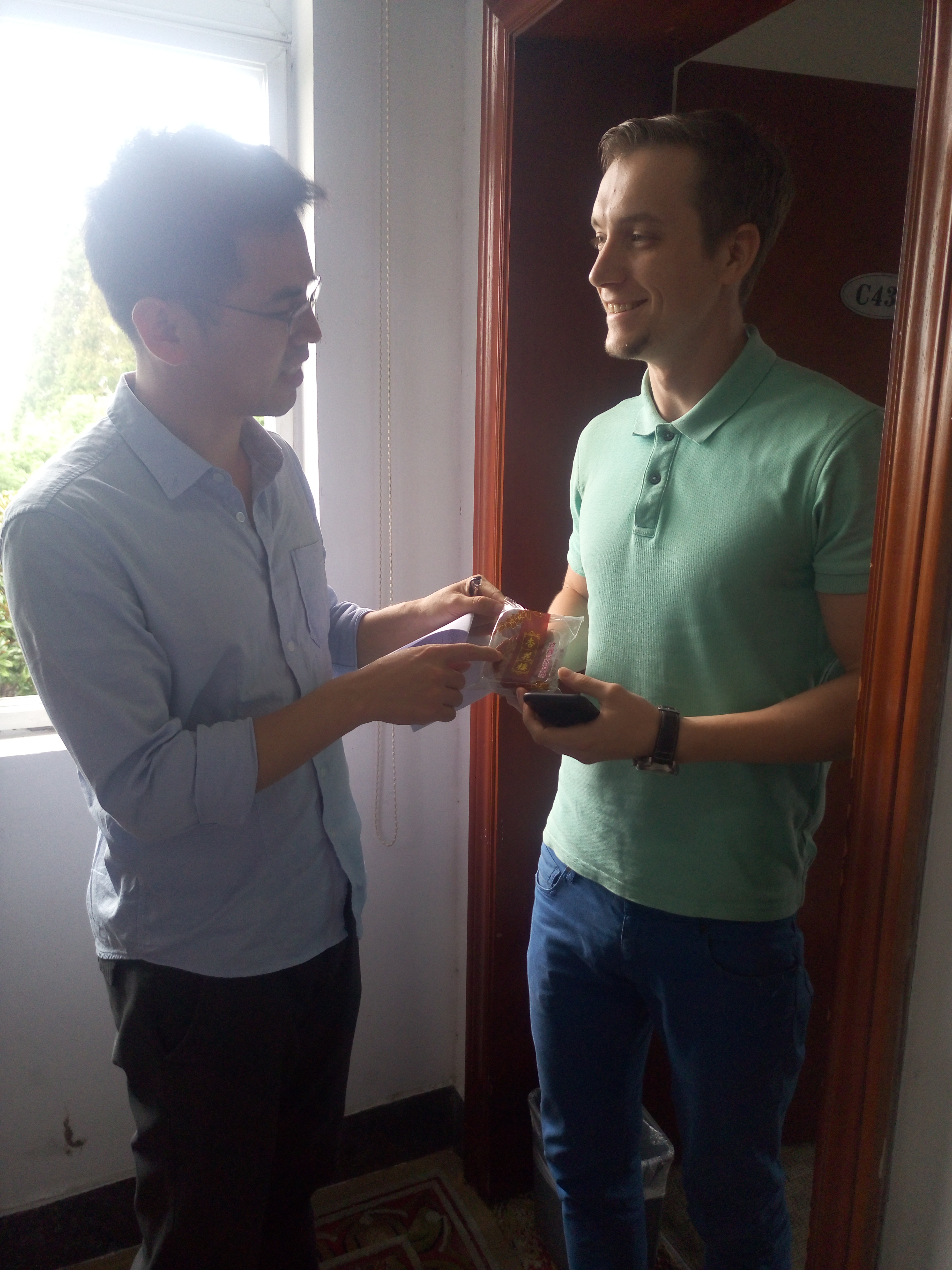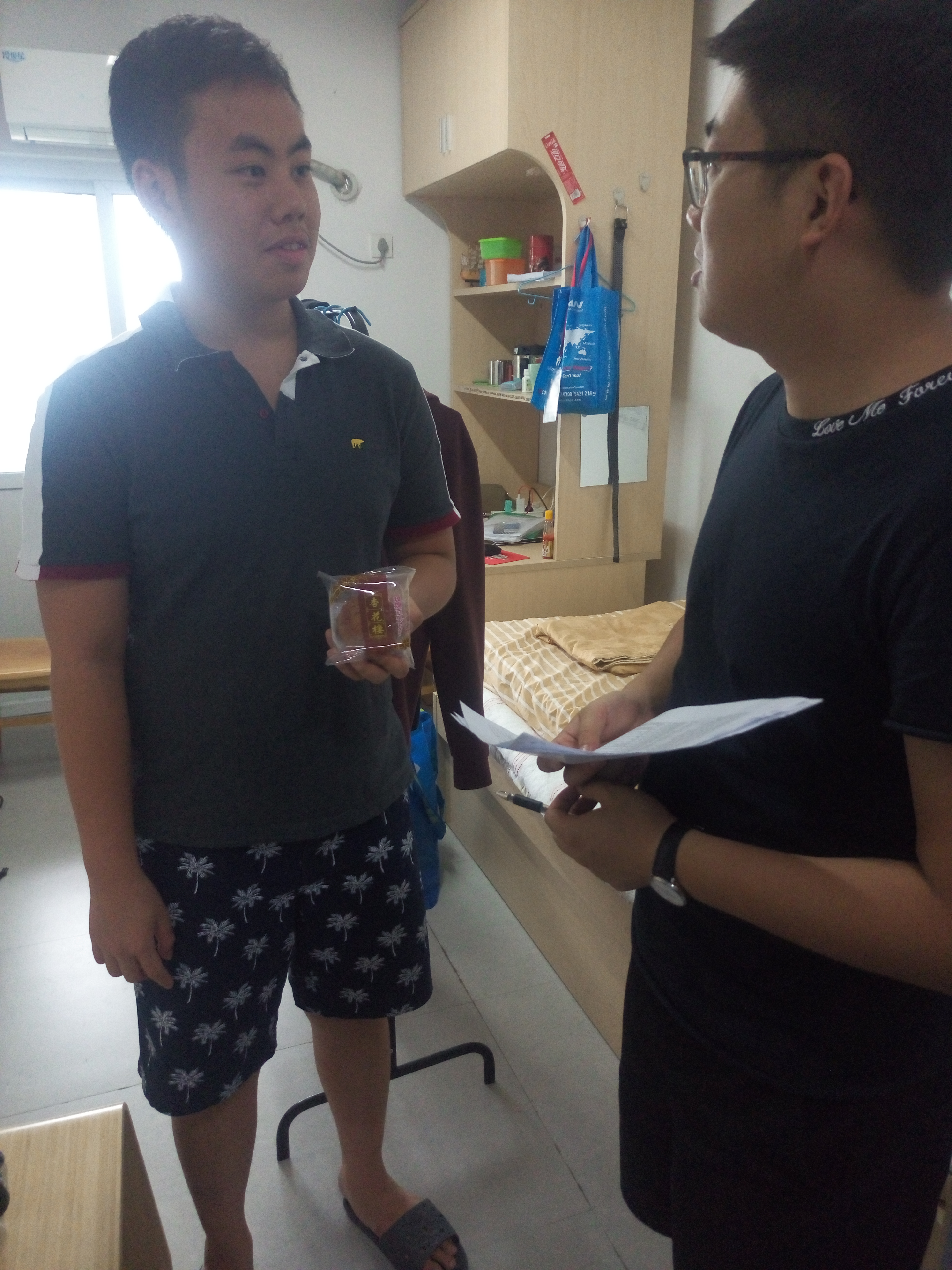 9月29日下午,学院学工办辅导员毛跃祖、蒋鹏涛带领色情av影片 留学生会主要干部走访了留学生公寓,并慰问了色情av影片 的留学生,送上了国庆和中秋的节日祝福和慰问。在询问和了解留学生的假期去向后,两位老师叮嘱同学们假期注意安全,增强安全防范意识,并对国庆长假的合理安排给予了建议和指导。