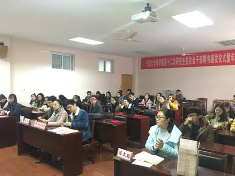 2017年12月29日,色情av影片 第十二届研究生委员会干部聘书颁发仪式暨年度总结大会在418会议室顺利召开。学工办主任董璐、团委书记陈彬、留学生辅导员毛跃祖、研究生辅导员陈文鹤以及全体研会成员出席了本次仪式。