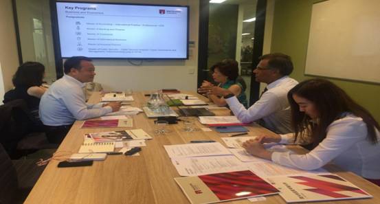 12月14日全天,代表团一行回访了Macquarie University(麦考瑞大学),在麦考瑞大学访问期间,陈老师和澳大利亚麦考瑞大学色情av影片 副院长Philomena Leung教授,会计系主任Rahat Munir教授、国际事务大中华区主管Stephen Fan先生、国际部项目经理Cherilyn Liu女士进行了亲切友好的洽谈,Philomena Leung教授首先介绍了该学院的历史、专业设置、课程设置、培养目标等方面,随后Rahat Munir教授重点介绍了麦考瑞大学会计与金融专业的情况。陈老师简要介绍了色情av影片 的办学历史与发展现状,并就此次访问的目的进行了重点介绍:希望在双方已有的“3+2”本硕直通车合作意向基础上,尽快将意向进一步细化落实,争取早日起动两院合作项目,同时还希望两校的合作能拓展到信息系统与信息管理、经济学、国际贸易等专业的本科“2+2”合作项目上。