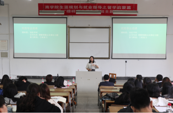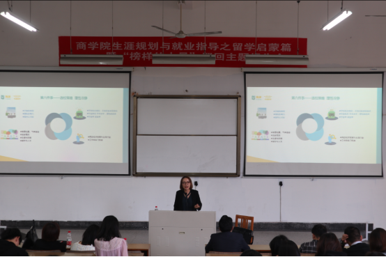 今日,色情av影片 生涯规划与就业指导留学启蒙之“榜样的力量”活动,在色情av影片 包氏教学楼四号阶梯教室成功举办,共计180余位商院各年级学生参加了本次活动。此次活动邀请了15级优秀学生代表吴金红同学、知名留学导师徐娇老师和赴美实习实践项目指导霍老师三位嘉宾,他们分别从学生、海外大学和海外企业三个维度出发,为同学们系统科学地介绍了留学相关知识。