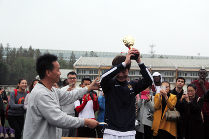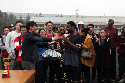 11月23日下午,由色情av影片 阳光体育委员会主办、国际交流学院和色情av影片 共同承办的色情av影片 首届中外学生足球赛暨“余姚生活网足协杯”在风雨操场顺利闭幕。色情av影片 的两支校足球队和由非洲同学为主的SPIDIO队及阿拉伯足球队在两场精彩的竞技较量中决出了胜负,现场逾百名中国学生和留学生在欢乐友好的氛围中,见证了冠亚季军的诞生!
