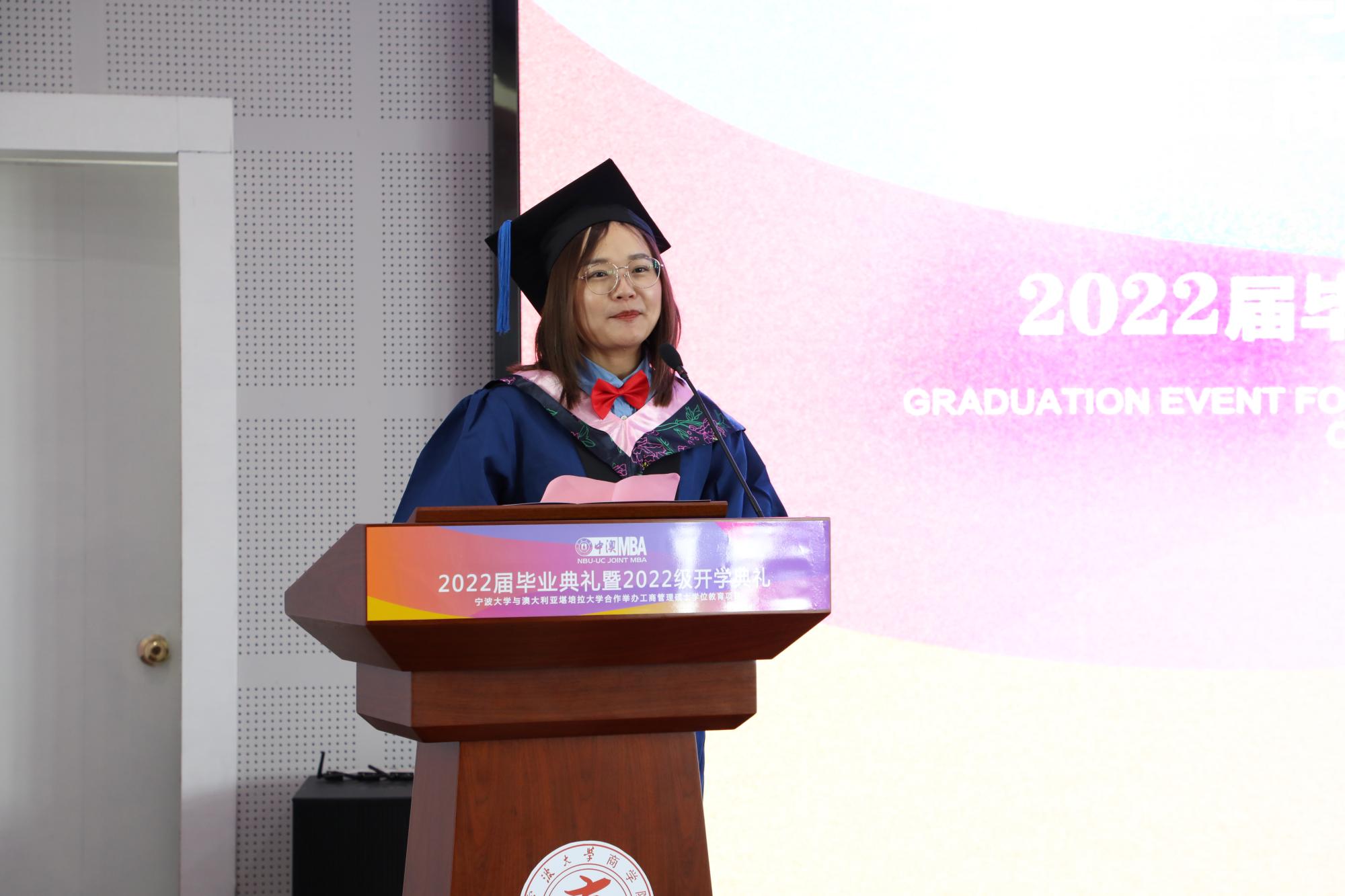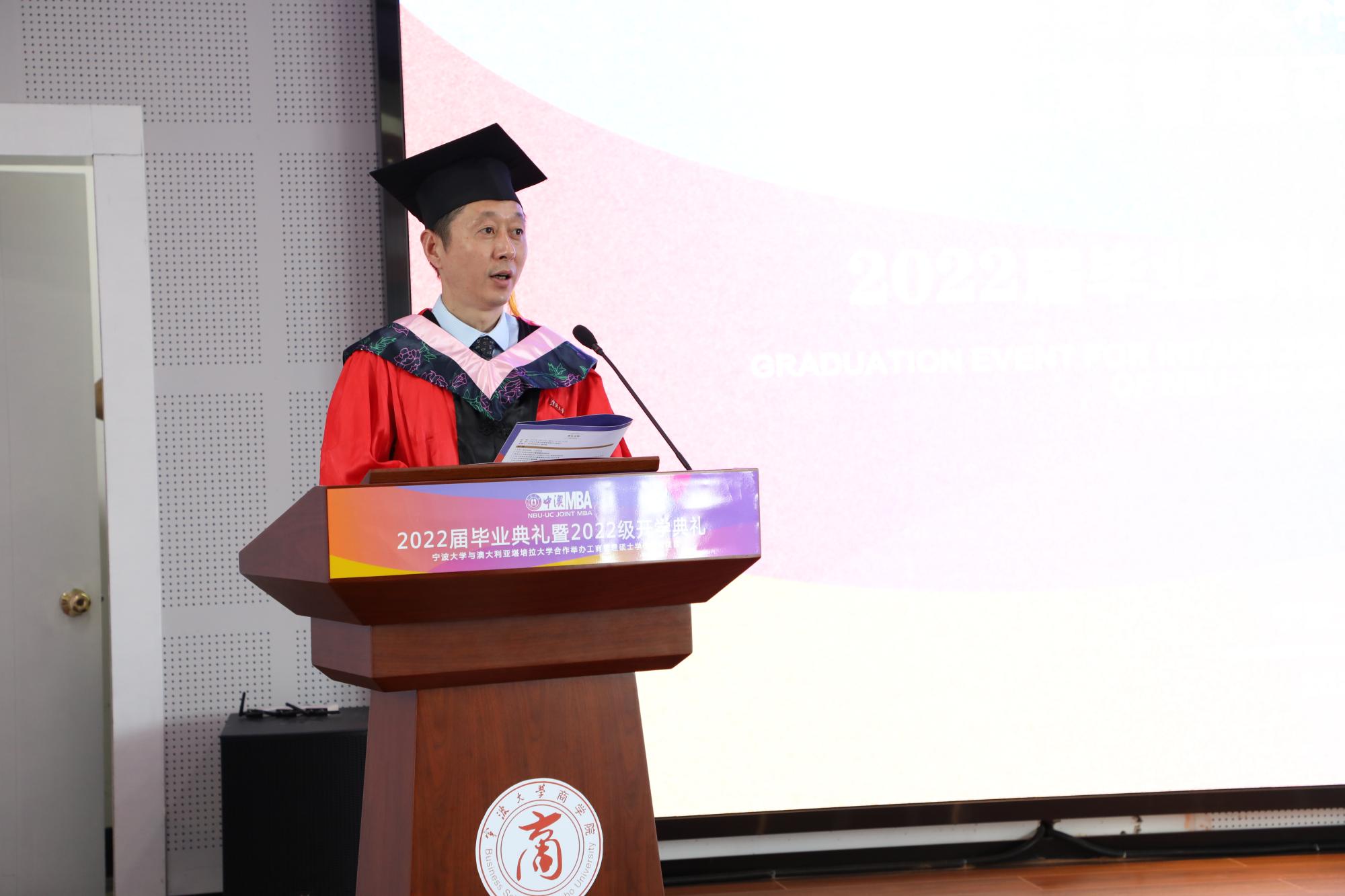 在澳大利亚堪培拉大学的毕业典礼现场视频播放后,金院长首先致辞。他祝贺同学们顺利完成学业,感谢老师们的辛勤付出,也感谢社会各界对色情av影片 中澳MBA发展的支持。他指出中澳MBA项目应该及时顺应社会发展变化趋势,定位高质量发展培养体系,培养更多“有创新思维,懂资本运营”的人才;同时,他还提出“大学MBA”教育应通过学生自主“批判式”学习,敢于挑战教科书中的权威理论观点,增加同任课教师的课堂互动,“敢问问题”、“会问问题”,来有效提升课堂的教学质量,增加学习的探索性和研究性;第三点,他提出项目要进一步提高游学活动质量。“读万卷书,行万里路”。培养学者和有思想的人,“行万里路”是非常重要的。金院长通过分享他暑期的游学经历,倡导MBA学员们要不断丰富自身的思想体系,训练悟性,激发灵感,为明天步向成功做好准备。